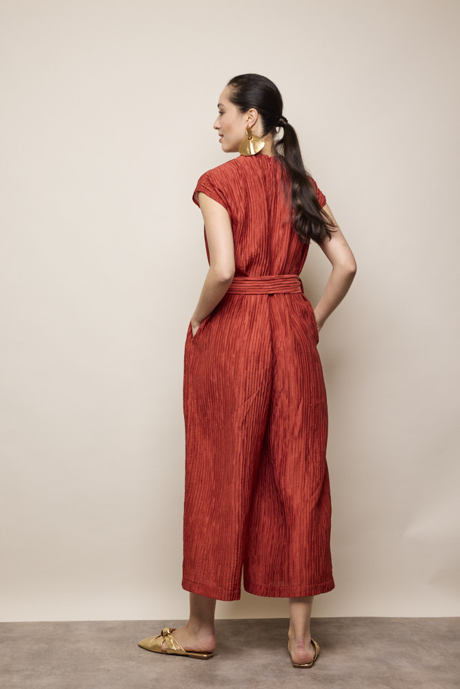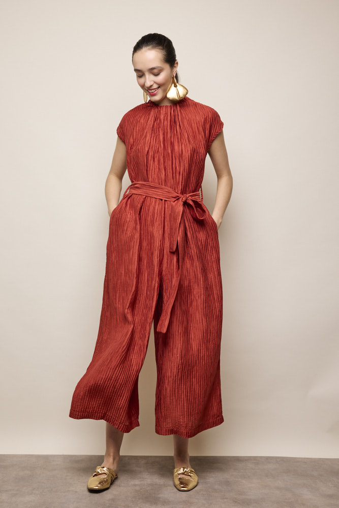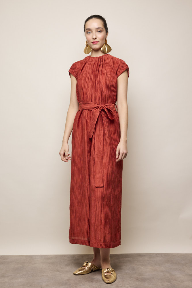 Ruched neck with tie belt in pleat detail fabric