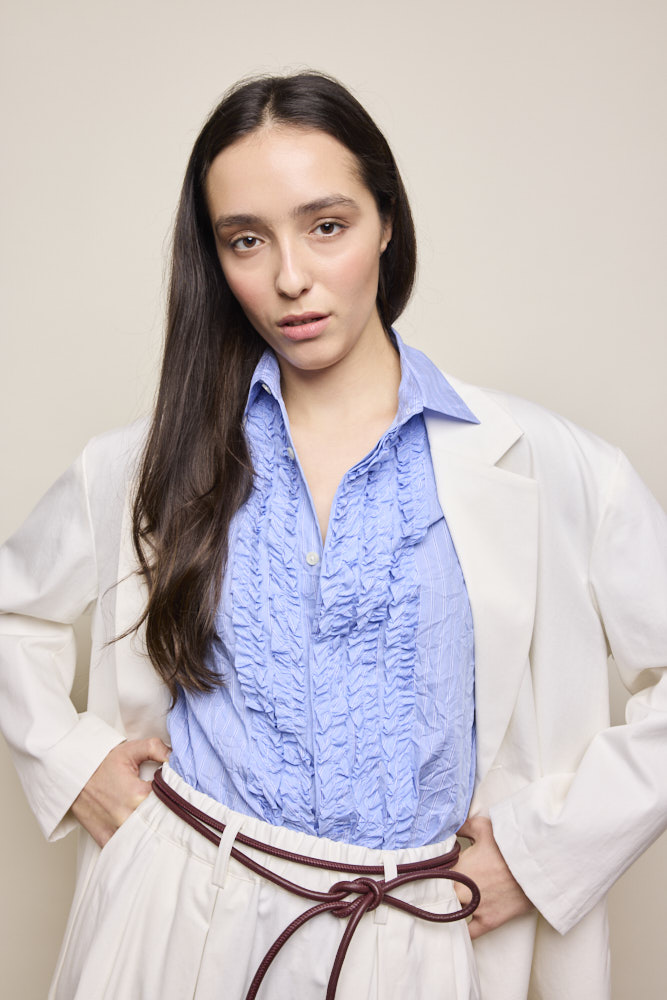Relaxed fit, short sleeves with ruffle front