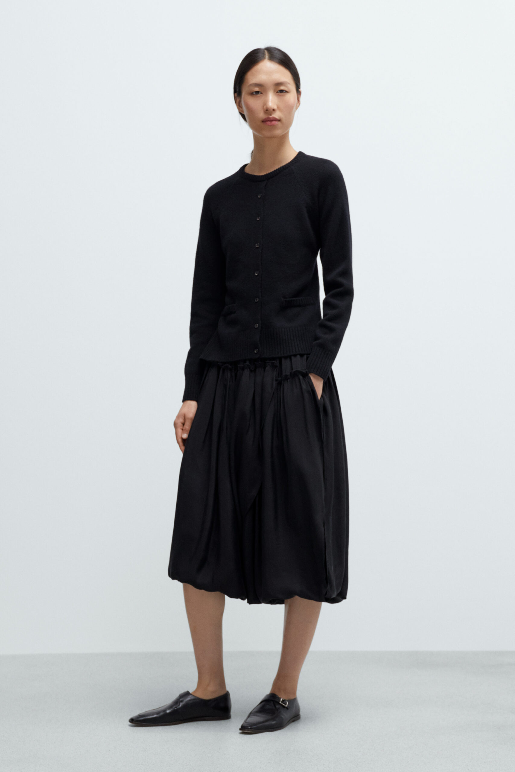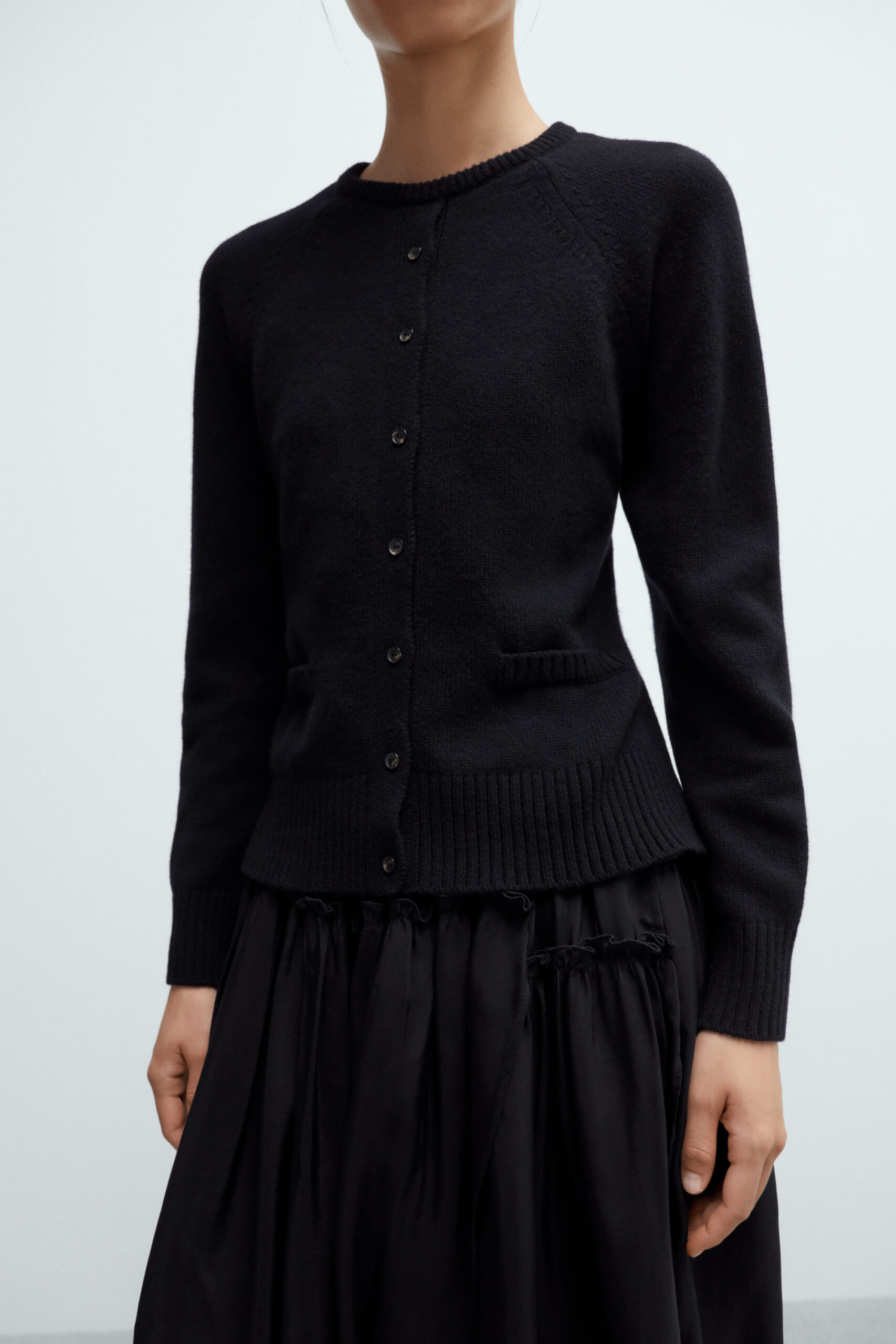 Regular fit crew neck fastened with a small back button, long sleeves, and full button-down front with two welt pockets.